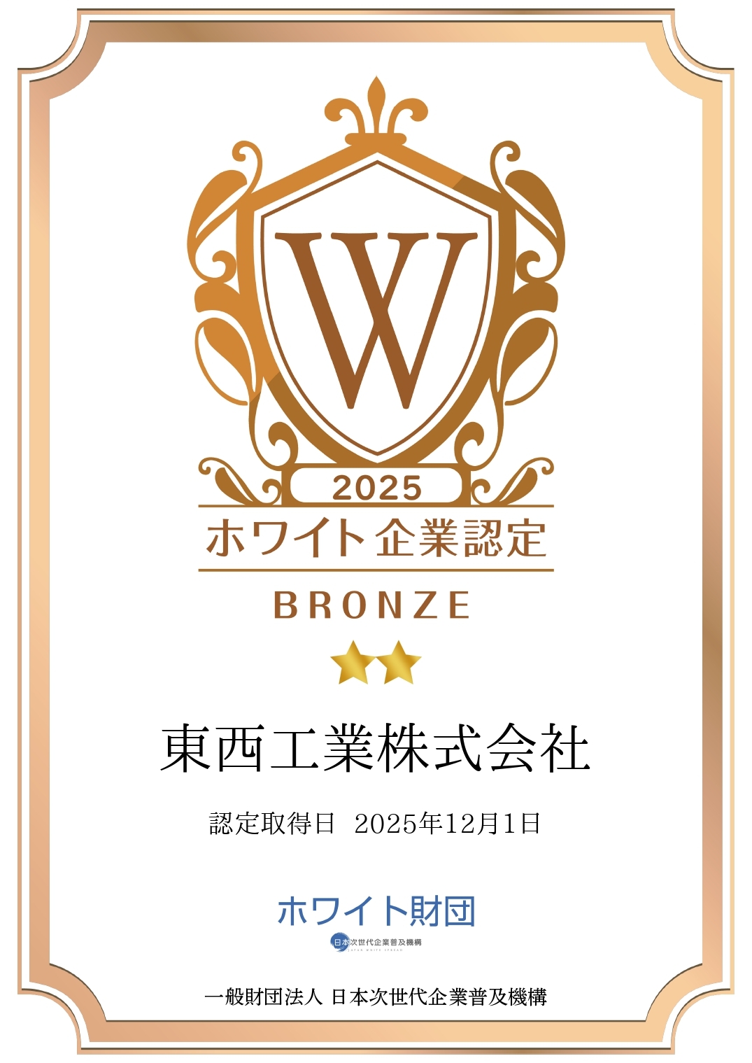 一般財団法人日本次世代企業普及機構(通称:ホワイト財団)様が行う「ホワイト企業認定」を取得いたしました。
